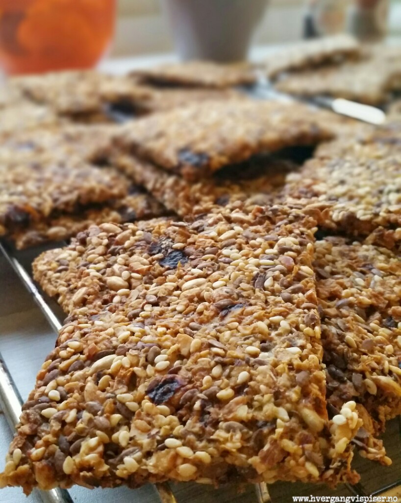 Slå av ovnen, og sett stekeovnsdøra på gløtt. La knekkebrødene stå i ovnen i 15 minutter før du tar dem ut. Bruk en stekespade og knekk bitene forsiktig fra hverandre.