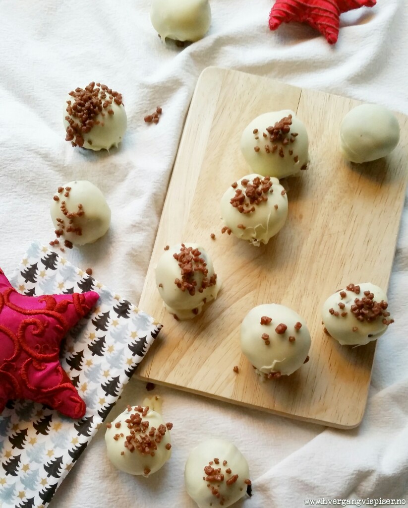 Dypp de kalde oreokulene i sjokoladen, jeg brukte to gafler til dette. Legg de så tilbake på fatene, og dryss evt sjokosmell over før sjokoladen stivner.