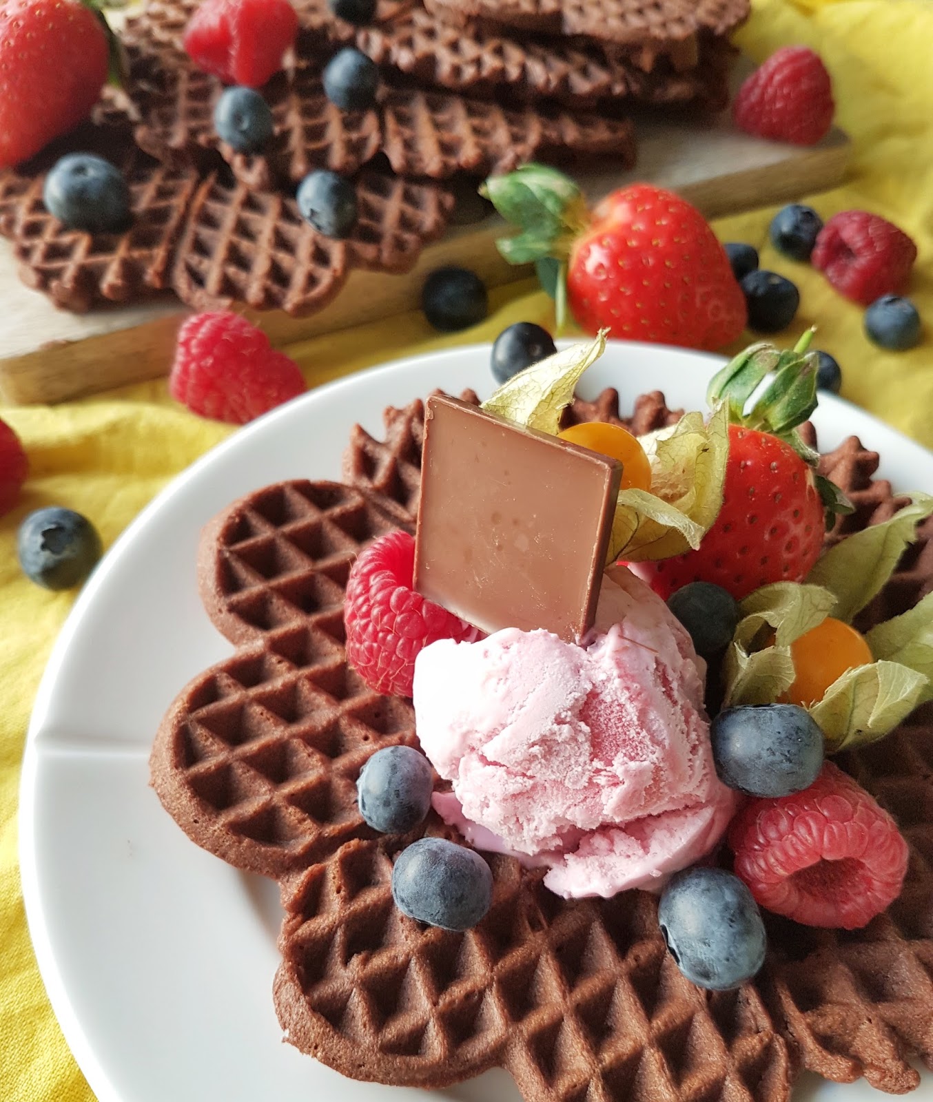 | Glutenfrie brownievafler med bringebæris og friske bær. Sååå godt! |