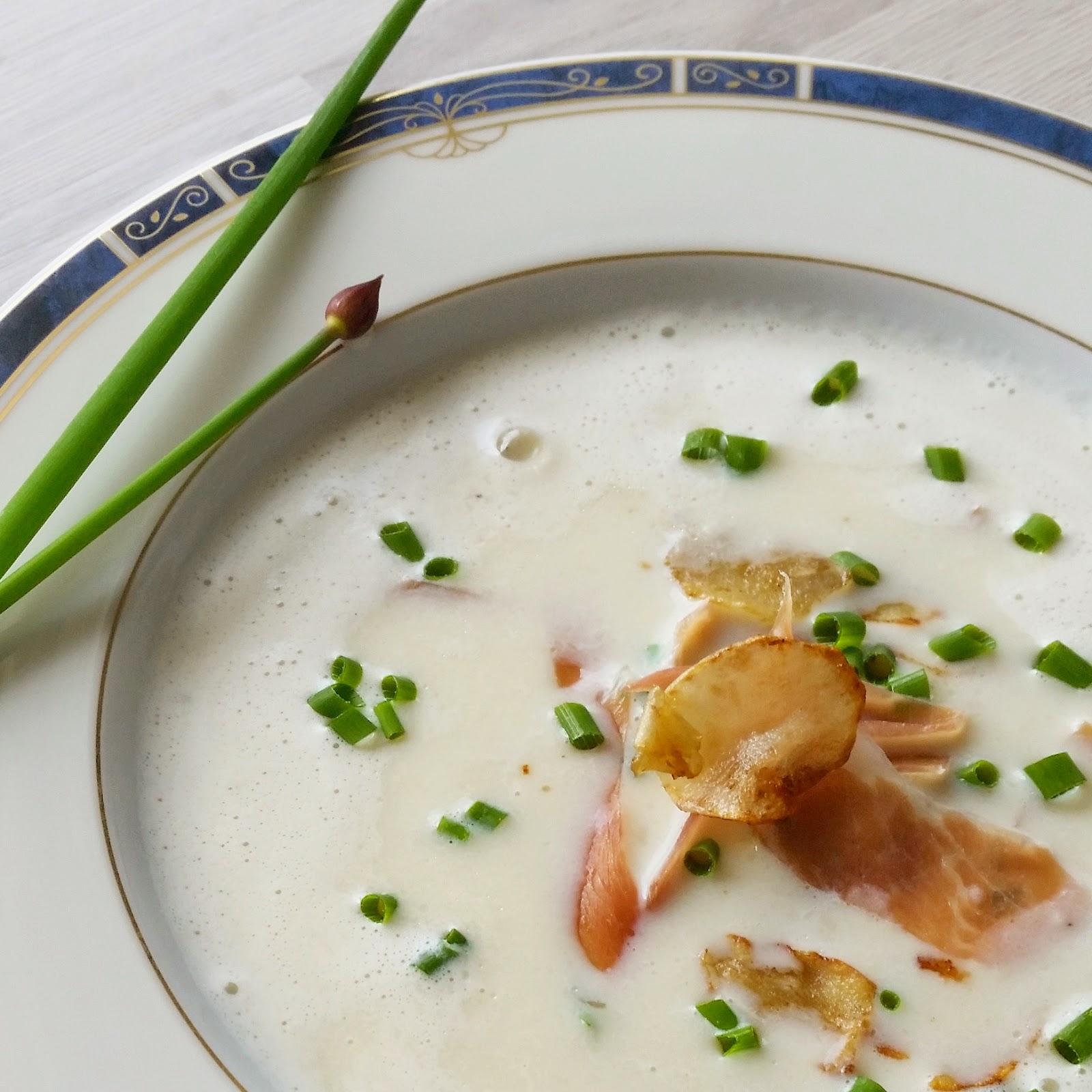 Server suppa med sprøstekte jordskokk-chips, spekeskinke og gressløk.